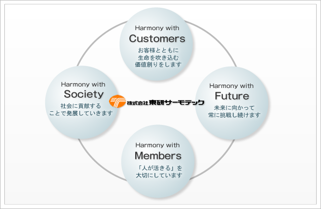 また、これらの仕事に関わる私たち社員一人一人の潛在能力を活かし、大切な人財になることを目指しています。私たちは、お客様?未來?社會?人と調和(Harmony with)を図りながら、企業(yè)としての社會的役割を果たし続けていきたいと考えています。