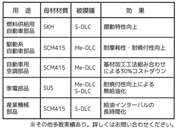 DLCは、高硬度?固體潤滑性を生かし、工具?金型だけでなく家電?自動車などの金屬部品にも展開されています。